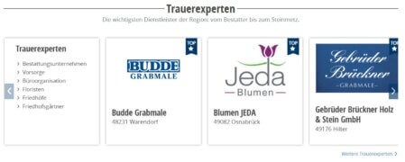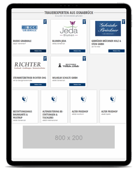 Wir bieten Ihnen die monatliche Festplatzierung auf drei prominenten Werbeflächen direkt auf der Startseite unseres Trauerportals. Diese Plätze sind exklusiv thematisch zugehörigen Unternehmen vorbehalten.