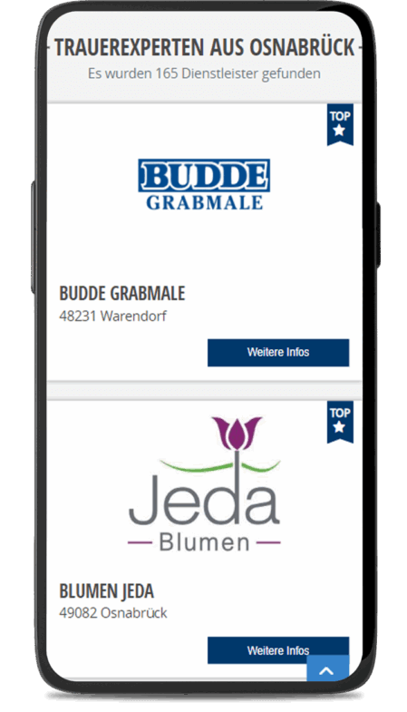Präsentieren Sie Ihr Unternehmen im Bereich Trauer und Abschied optimal auf traueranzeigen.noz.de. Unser Premium-Branchenbucheintrag ist schon ab nur 27,- € monatlich zzgl. MwSt. (Laufzeit 12 Monate) oder ab 30,-€ monatlich zzgl. MwSt. (Laufzeit 6 Monate) erhältlich.